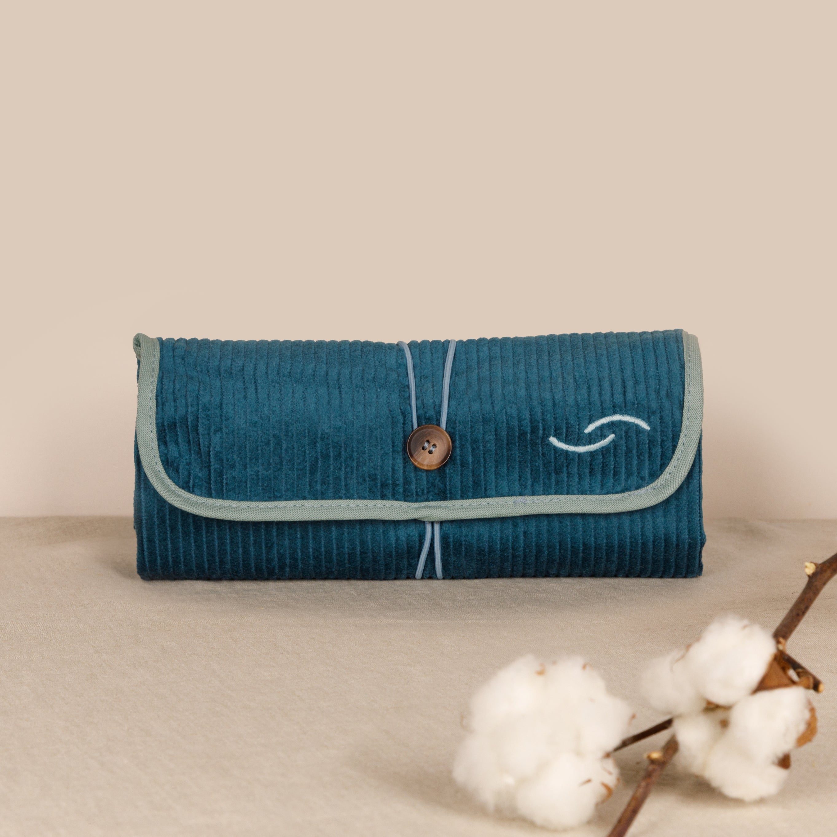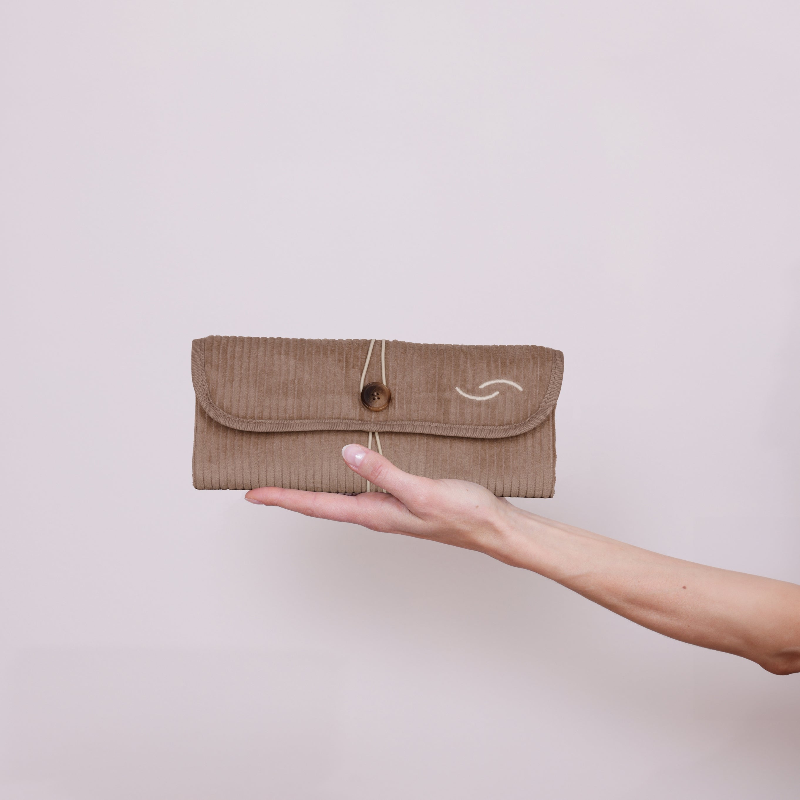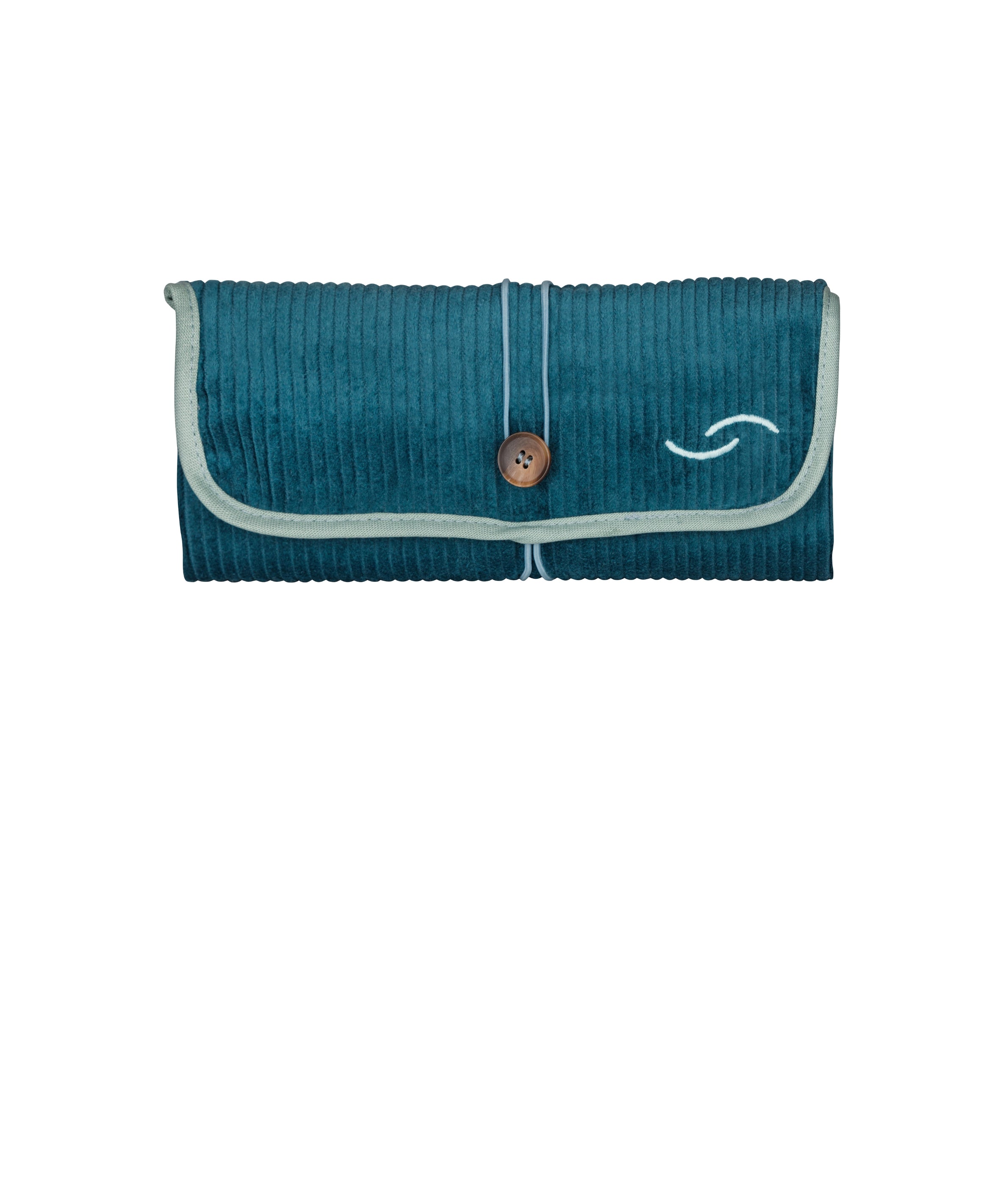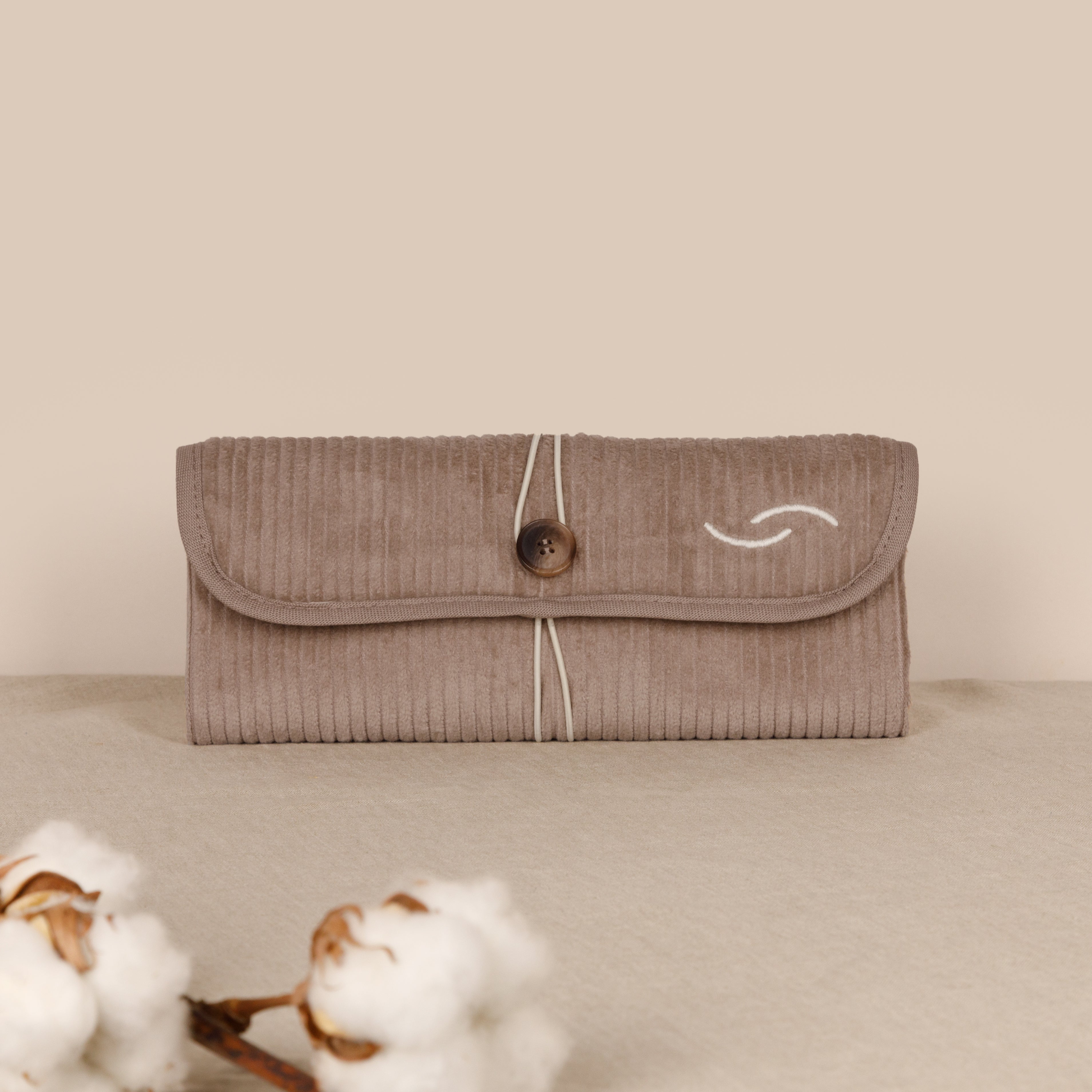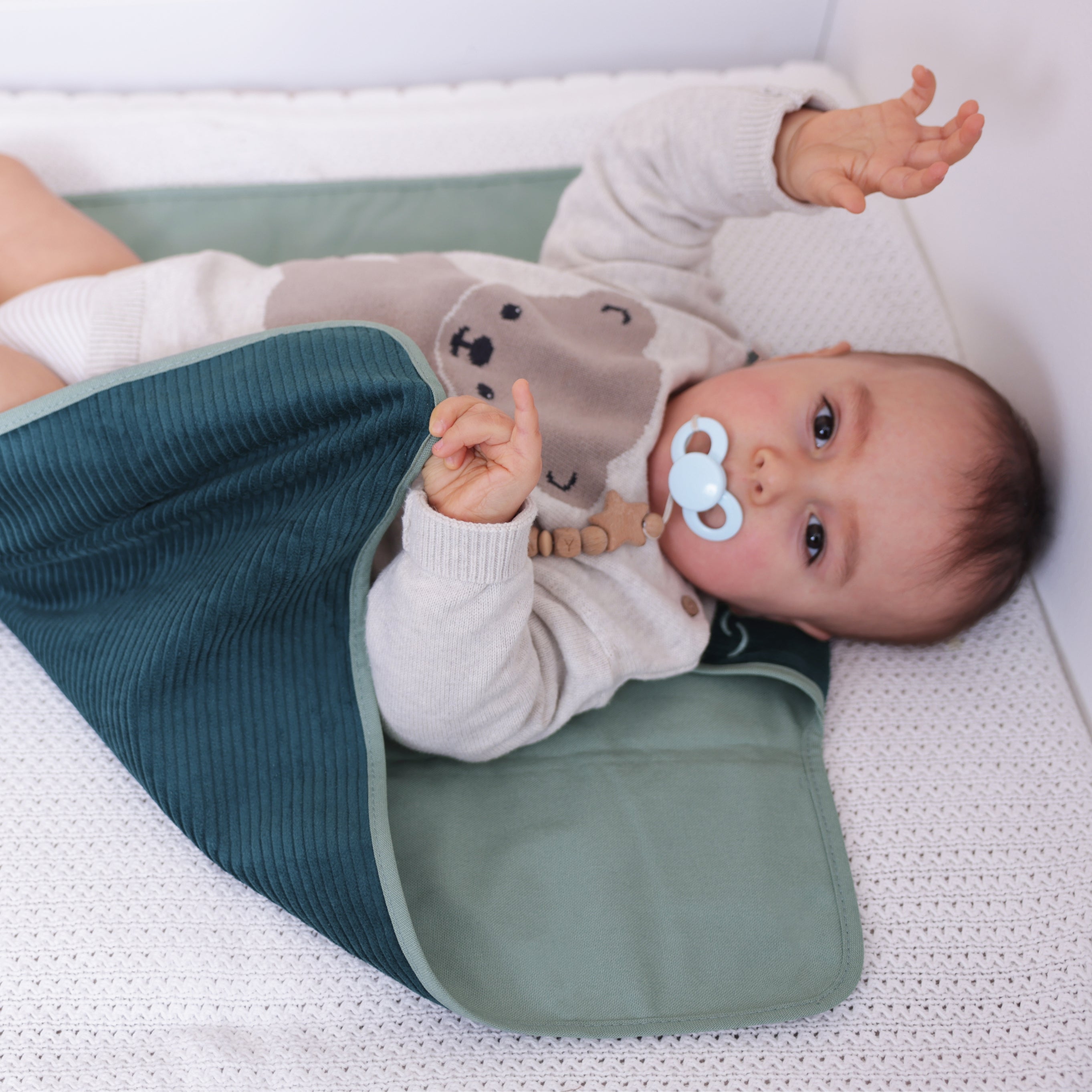 Der Cordstoff verleiht der Wickelunterlage nicht nur eine trendige Note, sondern bietet auch eine angenehme Haptik. Zudem harmoniert er perfekt mit dem Stil der Mom Bag. Das Innenmaterial ist aus wasserabweisendem Canvas und ermöglicht ein sauberes Wickeln ohne Rückstände.