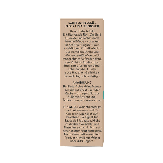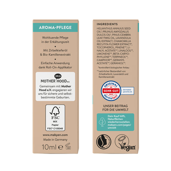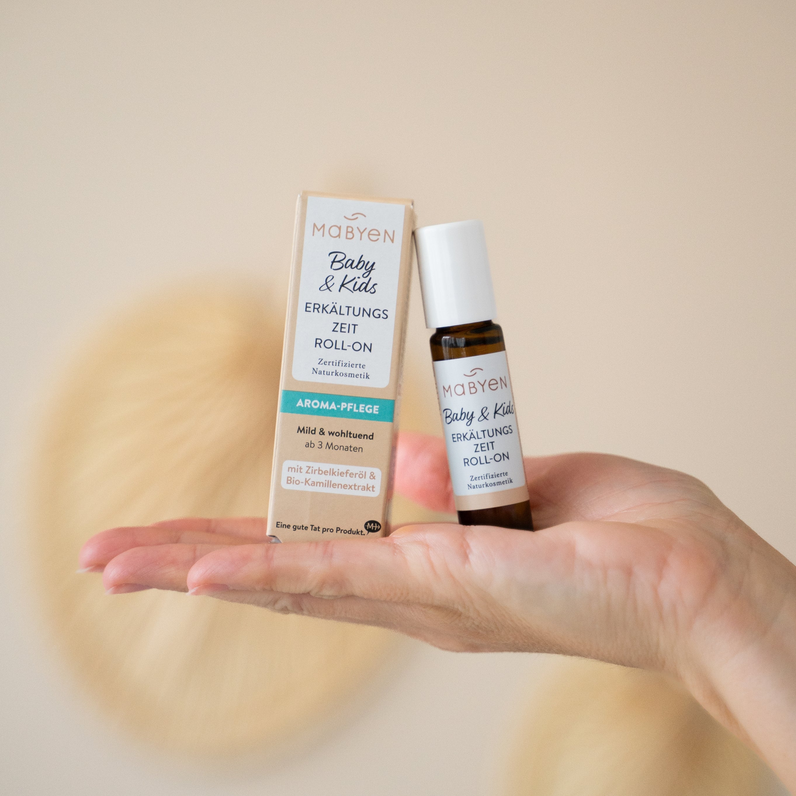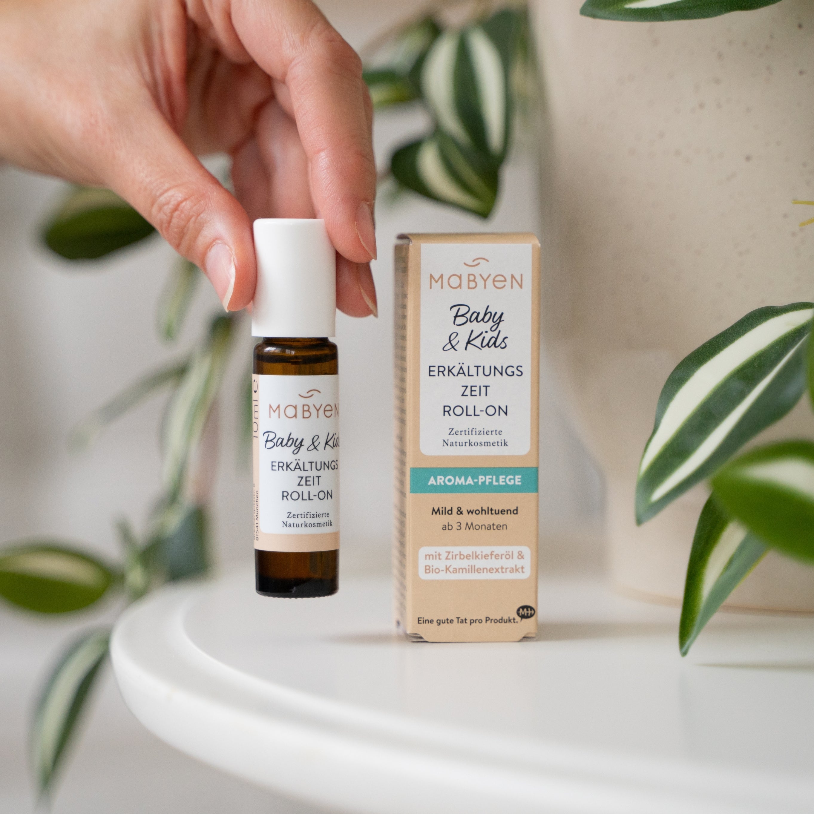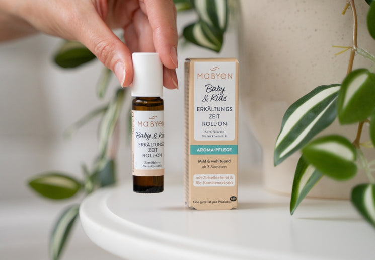 In der Erkältungszeit möchte man seinem kleinen Schatz besonders viel Nähe und Geborgenheit schenken - das Erkältungszeit Roll-On unterstützt dich dabei auf sanfte Weise. Mit beruhigendem Zirbelkieferöl, Bio-Kamille und Bio-Mandelöl pflegt es die empfindliche Haut deines Babys ab 3 Monaten besonders mild und sehr gut verträglich (dermatologisch getestet). Der praktische Roll-On macht das Auftragen auf Brust oder Rücken einfach und zu einem liebevollen Moment, den ihr gemeinsam genießen könnt. Das Erkältungszeit Roll-On ist zertifizierte und vegane Naturkosmetik aus Deutschland und verbindet natürliche Sicherheit mit liebevoller Pflege für die empfindliche Haut deines Babys. Mit jedem gekauften Produkt unterstützt du den Motherhood e.V. für sichere und selbstbestimmte Geburten in Deutschland. Gleichzeitig gleichen wir gemeinsam mit GREENZERO die Umweltauswirkungen unserer Produkte durch Renaturierungsprojekte aus und stärken so die Biodiversität und natürliche Lebensräume in Deutschland.