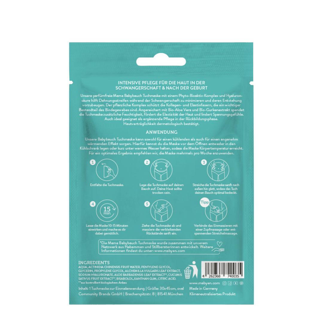 Auch in der Rückbildungsphase kann dich unsere Tuchmaske unterstützen, indem sie die Haut pflegt und nährt.