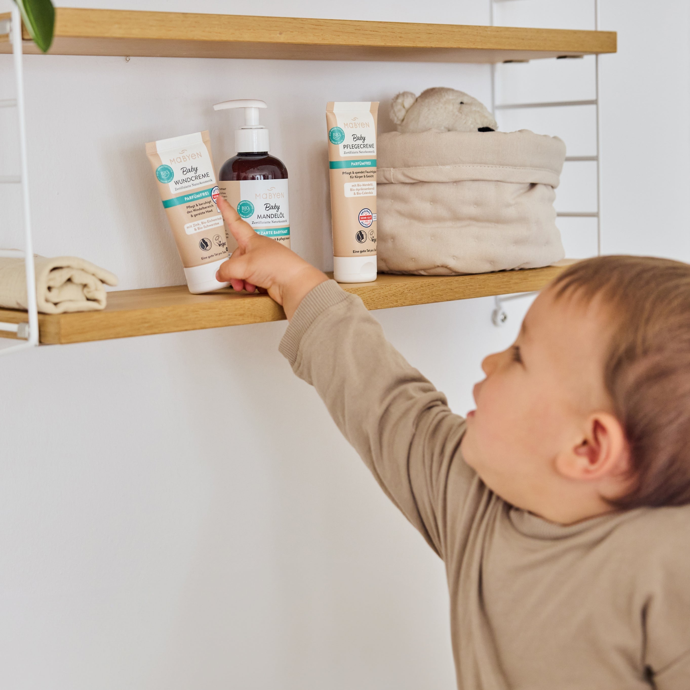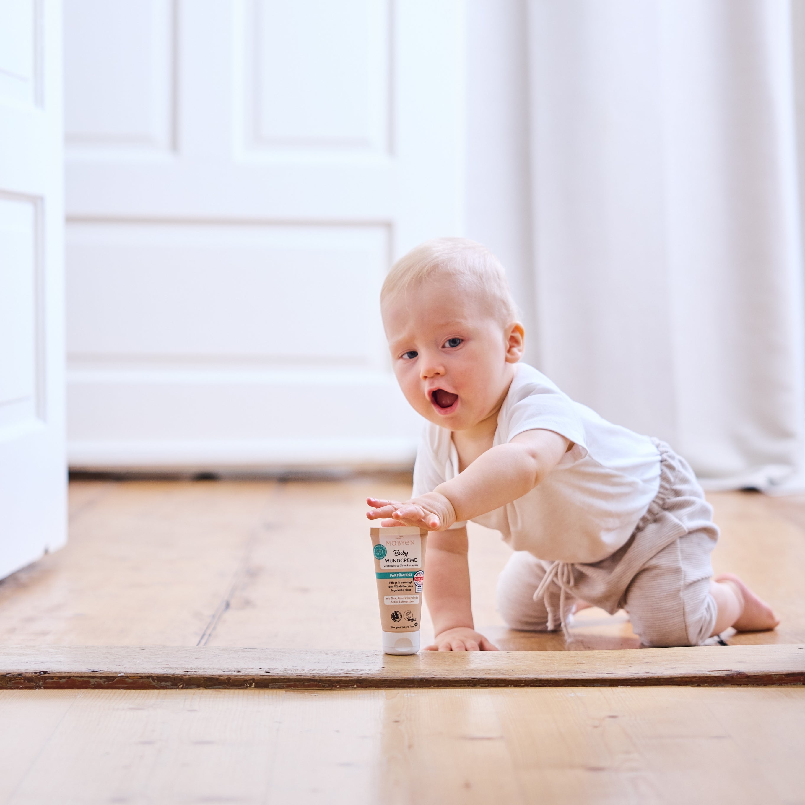 Eine kleine Menge der Wundcreme auf der Haut im Windelbereich deines Babys oder Kindes verteilen und sanft in die Haut einmassieren. Kurz einziehen lassen.