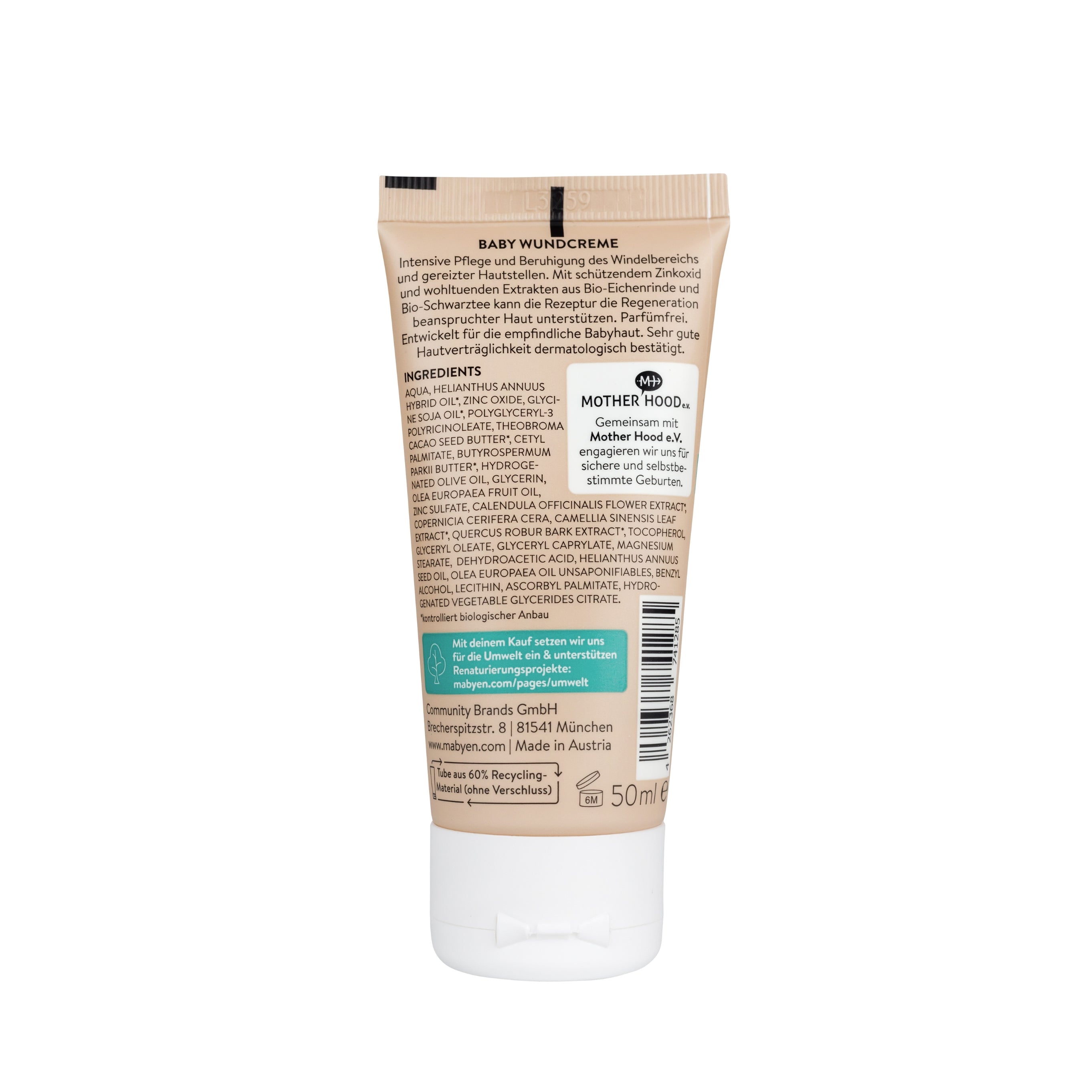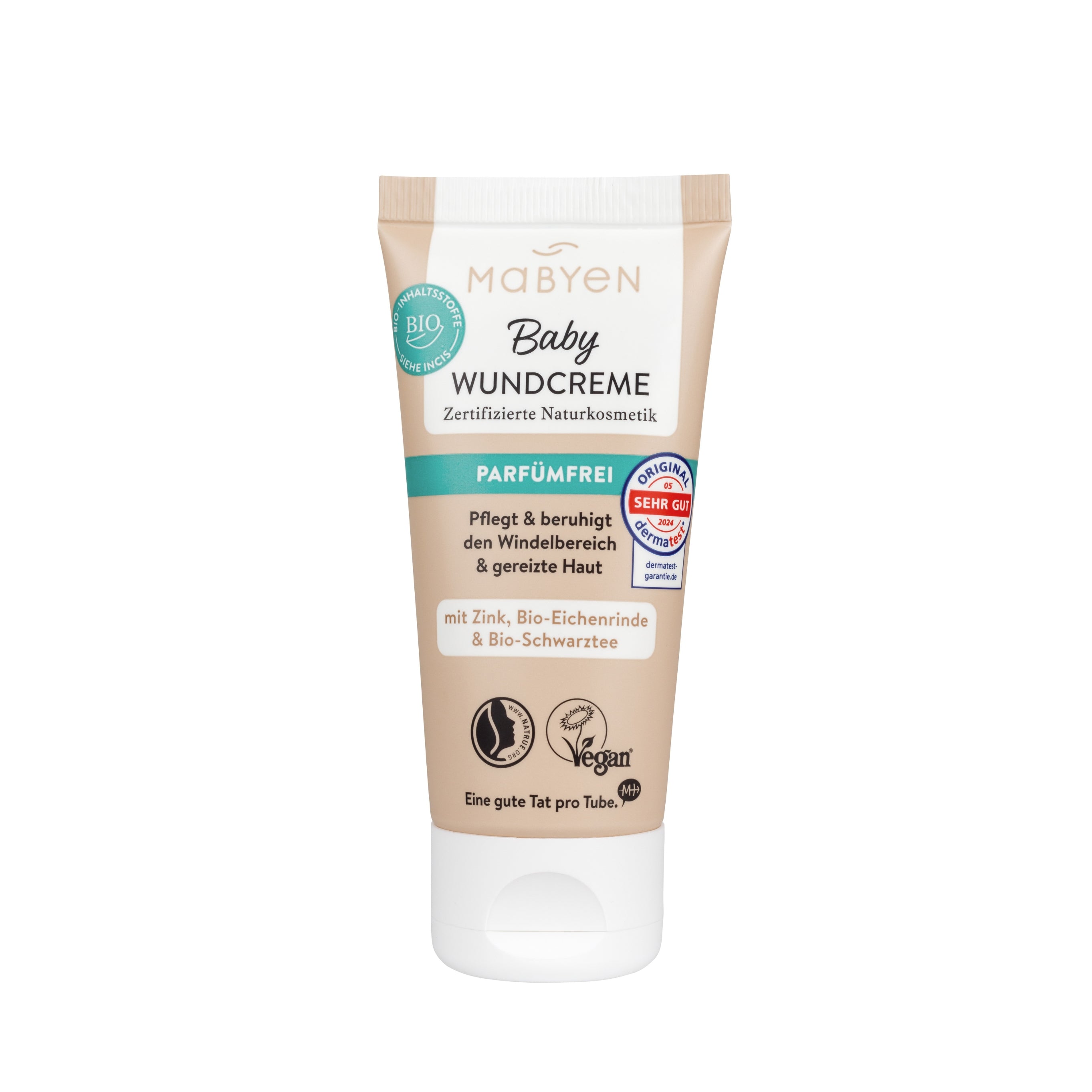 Die MABYEN Baby Wundcreme bietet sanfte Pflege für den empfindlichen Windelbereich deines Babys. Mit natürlichen Inhaltsstoffen wie Zink, Bio-Eichenrinde und Bio-Schwarztee beruhigt sie gereizte Haut, fördert die Wundheilung und stärkt die natürliche Hautschutzbarriere. Die Creme ist frei von Parfüm, Silikonen, Mineralölen, Sulfaten und Mikroplastik – ideal für die tägliche Anwendung bei empfindlicher Babyhaut. Vereinzelt kann es bei kälteren Temperaturen aufgrund der enthaltenen Sheabutter zu einer leicht krümeligen Rezeptur kommen. Keine Sorge, das stellt keinen Qualitätsmangel dar - durch Verreiben der Creme lösen sich die kleinen Körnungen wieder auf. Jeder Kauf hilft dabei, Gutes zu tun: Wir fördern die Organisation Mother Hood, die sich für sichere und selbstbestimmte Geburten einsetzt, und tragen gemeinsam mit GREENZERO zur Unterstützung von Renaturierungsprojekten in Deutschland bei.